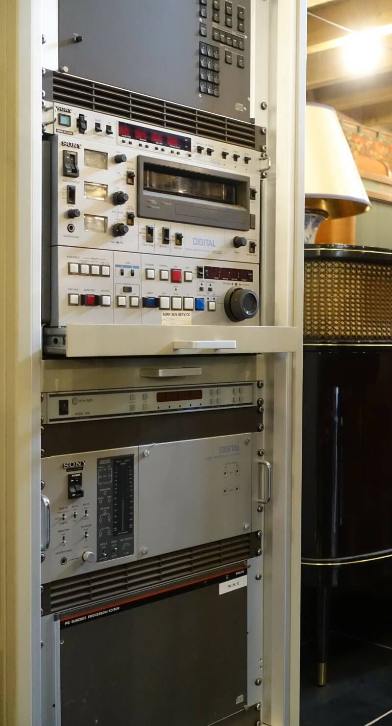 Rechts ziet u een Philips Encoder-Rack. In de begintijd van de CD werden analoge opnamen met een PCM-adapter (hier Sony PCM-1630) en een U-matic videorecorder (hier Sony DMR-4000) digitaal op een videoband gezet en via dit rack naar de laser gestuurd die die de digitale data als microscopische kleine pits in een spiraalvormig reliëf op een glasplaat brandt, de master-CD.